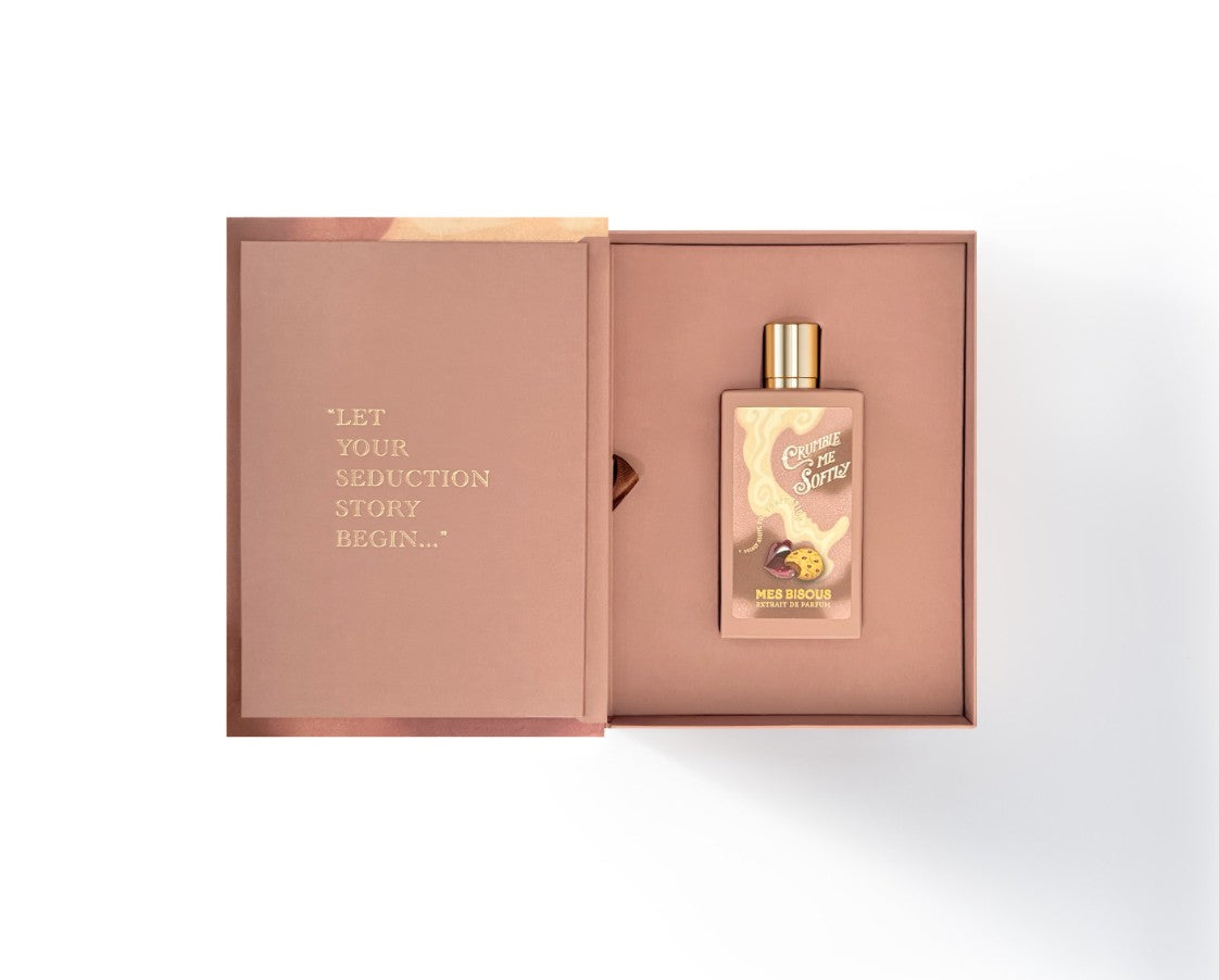Crumble Me Softly opens with tempting gourmand top notes of chocolate, caramel, and cookie crumbs, evoking the warmth of a freshly-baked treat. The heart introduces a spicy-elegant trio of saffron, nutmeg, and lavender, adding intrigue and sophistication to the sweetness. From there it settles into a rich and complex base of patchouli, amber, oud, cypriol, and moss, marrying warmth and woods with gourmand depth.